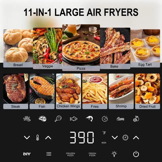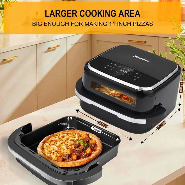 Versatile & Super Fast Cooking: 11-in-1 multifunctional flat air fryer with rapid top and bottom airflow technology, easily select from air frying, baking, pizza making, grilling, dehydrating, and more. One-touch presets deliver perfect results every time.