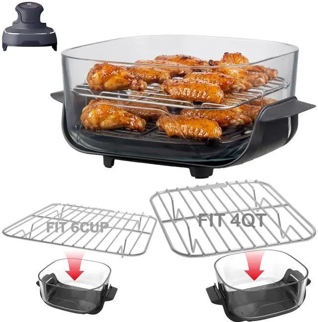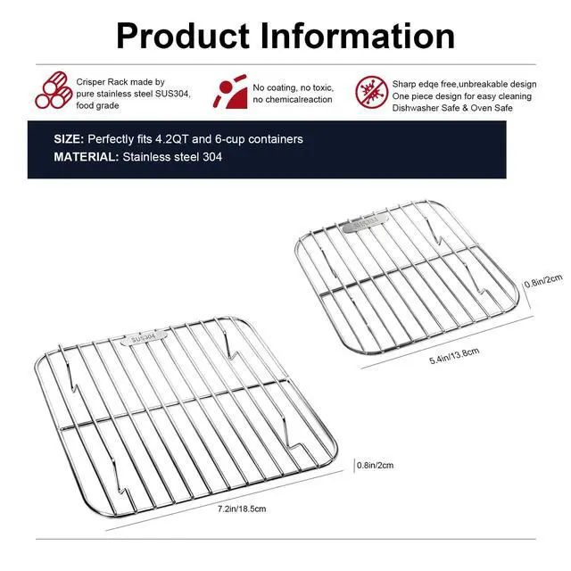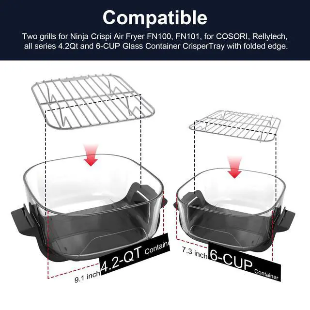 You will receive two grills (7.2 inches and 5.4 inches). The large size fits 4QT/2.5QT containers, and the small size fits 6-CUP containers, Custom-designed for Ninja Crisp Air Fryer glass containers FN090, FN091, FN100, FN101 series, Place this rack on top of the original one to double your cooking space for two-layer grilling