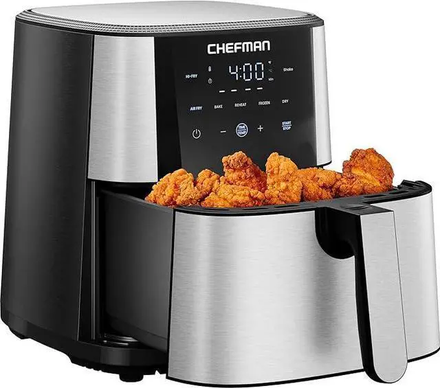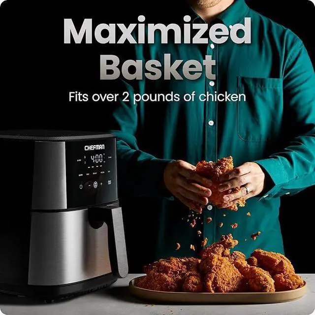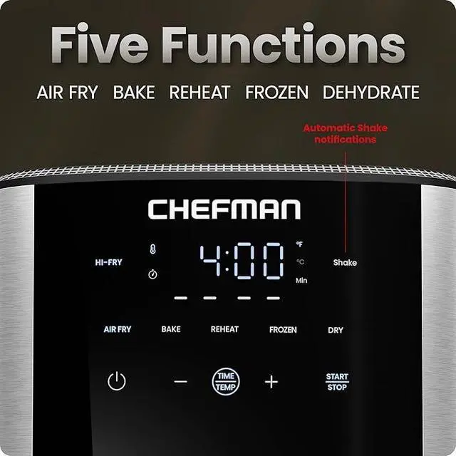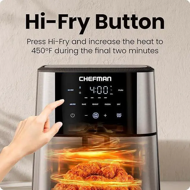 BRING THE HEAT: When you press the HI-FRY button during the final two minutes of cooking, Chefman air fryer cranks up the temperature to 450°F. Our HI-FRY function puts a beautiful golden-brown crisp on air fried potatoes and chicken.