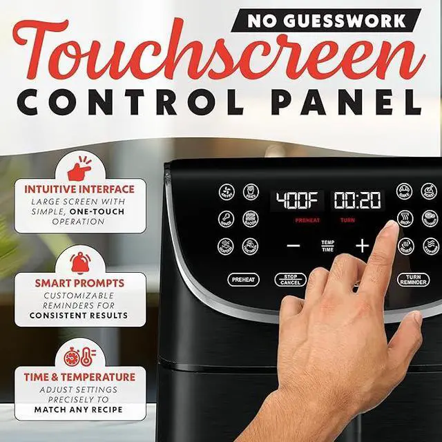 Digital LED Display with Touch Controls - Intuitive control panel displays time and temperature for precise adjustments and includes built-in Preheat and Turn Reminder indicators for guided cooking.