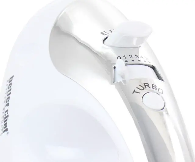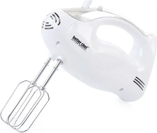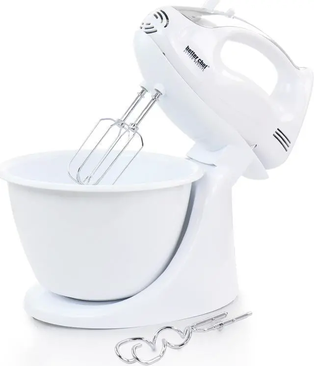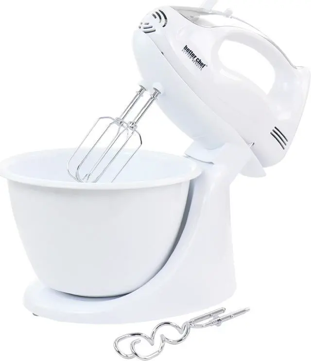 Mix, Blend, Beat and Kneed all with the Better Chef 200 Watt Stand/Hand Mixer in White with Mixing Bowl. Ergonomic handle for one handed operation offers a powerful 200 Watt motor for most of your everyday mixing needs. Ideal for quickly and easily mixing up your favorite cookie dough's, mashed potatoes, bread dough's and so much more. Includes interchangeable beaters and dough hooks and mixer stand with mixing bowl. Dishwasher safe accessories for easy clean up and compact for convenient storage.