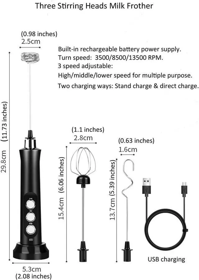 Portable & Rechargeable: With a built-in rechargeable battery, you can charge this electric frother anywhere by USB cable, which prevents you from the trouble of finding new battery replacements. Also all the whisks are detachable, they can be packed conveniently in one small bag, it is perfect for camp and travel.