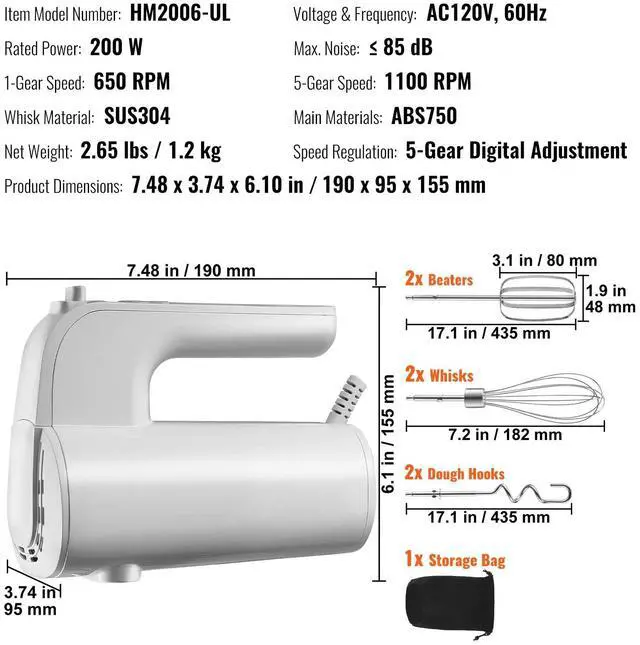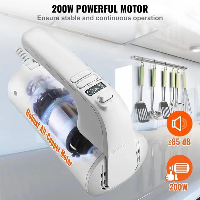 Powerful 200W Motor: Our electric hand mixer is equipped with a powerful 200-watt motor that provides reliable and consistent performance for all your mixing needs. Its maximum noise level of 85 dB ensures stable output for continuous work, while the bass and low noise levels are less likely to disturb others.