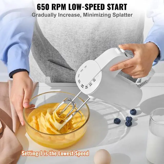 Low Speed Start Function: The hand mixer electric handheld features a gentle starting speed of 650 RPM. When you set it to the 1st gear, it initiates at the lowest speed. Starting low and gradually increasing speed, it effectively minimizes splatter.
