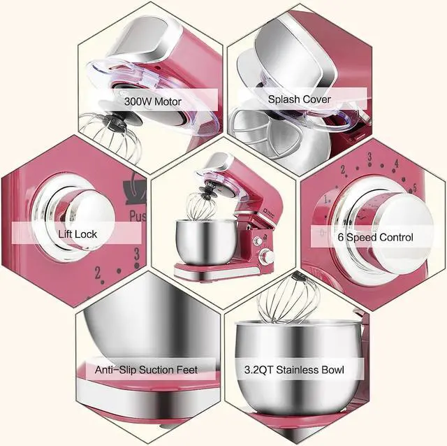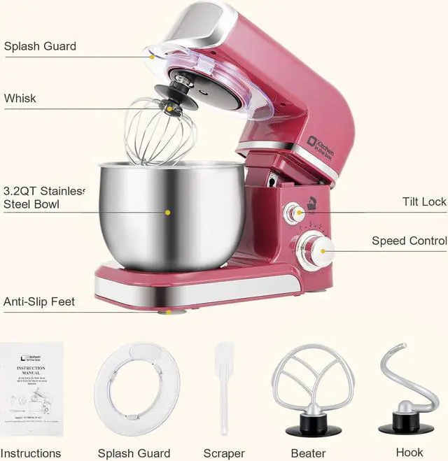 3.2Q t Capacity and Tilt Head Design - Our little kitchen mixer equipped with 3.2Q t stainless steel bowl, suitable for new baker, 1-2 members family or couples, easy to operate and clean up. Tilt-head design mixer allows access to install or uninstall bowl and accessories easily. And transparent anti-splash lid could prevent the ingredient making a mess.