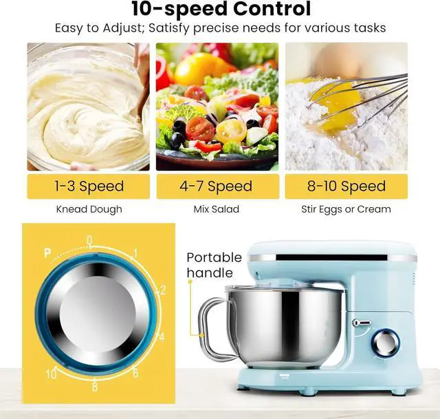 SAFE &STURDY BOWL - Made of food-grade stainless steel, it ensures the health of the whole family; Large 6QT capacity meets daily kitchen requirements; The bowl can be fixed to the base, which makes it stay steady during mixing work; Considerable design of a handle will facilitate your operation; With suction cups on the bottom of the base, the kitchen mixer wont move all over the counter