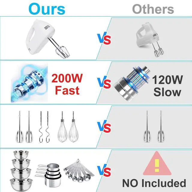 Electric Handheld Mixer: With 200 Watt powerful motor and 5 speeds light weight hand held mixer can help to find the right speed for every mixing task. You can slowly increase speed for optimal mixing consistency and to prevent messes. The kitchen hand mixer include 2 stainless steel beaters,2 balloon whisks, 2 dough hooks. The attachments are dishwasher-safe and easy to remove with press button.