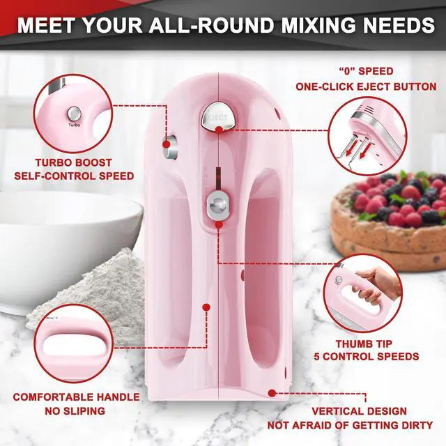 The little baking helper makes baking more powerful. Satisfy your various food desires. Lord Eagle's mixers is very suitable for beginners. Why is this? Newest Upgrade Max To 400W All-Pure Copper MotorIt can rotate up to 1100 revolutions/min. With 5-Speeds Mix dough, eggs, milk, butter, cake or even cream quickly, efficiently and easily, make it very smooth and creamy. Turbo Boost / Self-Control Speed & Ejection Button: Avoid ingredients splash. Meet your mixing needs in all directions. Comfortable handle: Ergonomic grip is comfortable and convenient to operate. Suitable for the elderly and children. 304 Stainless Steel: Robust and Durable. Food contact usable. Easy to clean and dishwasher safe. Porous cooling system: Delay the life of the host. 5 Speed Grade Speed1This is a good starting speed for mixing dry foods. Speed2Best speed to start mixing liquid ingredients, salad dressings. Speed3For mixing cakes, cookies and breads. Speed4For creaming butter and sugar, beating uncooked candy, desserts etc. Speed5For beating eggs, cooking icings, whipping potatoes, wipping creams etc. Specification Material: 304 Stainless Steel, PVC Color: Pink Size(L*W*H): 7.5×3×5.519×8×14.5cm Weight:1.9lb Rated voltage: 120V60HZ Power: Max To 400W Work stalls :1-5 File / Variable Speeds Package included 1 x Electric Hand Mixer 2 x Beaters 2 x Dough Hooks 1 x Whisk 1 x Instruction