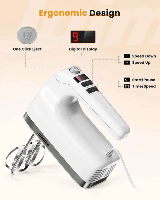 DIGITAL DISPLAY & 4 TOUCH BUTTONS - The hand mixer electric features 4 soft touch buttons and a high-definition LCD display, it's easier to adjust the speed settings and check the current mixing time. The eject button above the handle allows you to quickly eject all accessories.