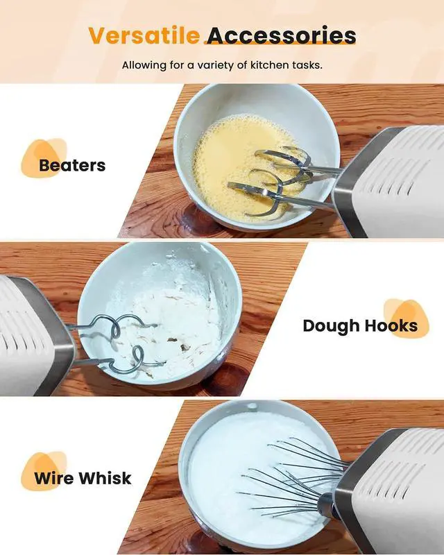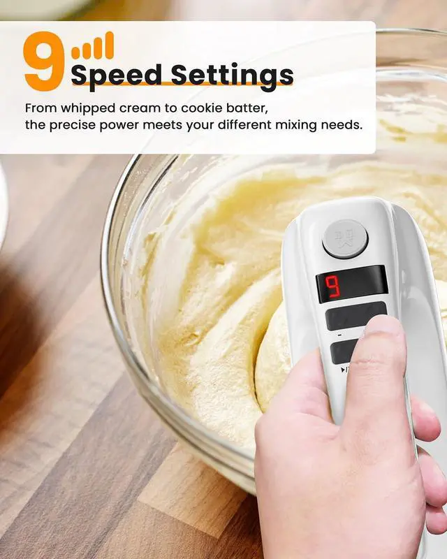 PRECISE 9 SPEED SETTINGS & TIMER - The hand mixer electric handheld has 9 speed levels, so you can gradually increase the mixing speed from 1 to 9 speeds, to prevent splattering and bloating, and allowing food to be well-mixed. It also has a timer function that allows you to follow the time on the recipe, you don't have to guess the time anymore.