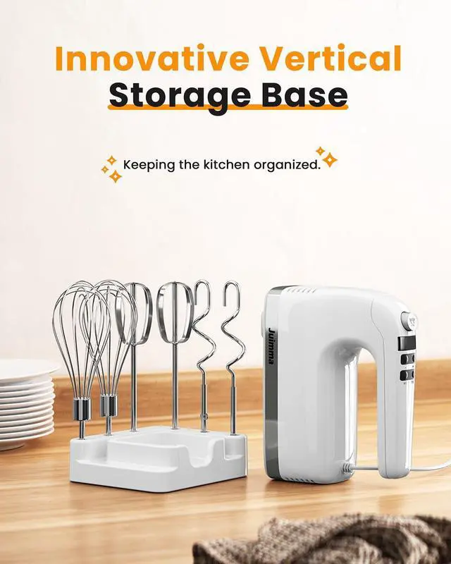 WHAT WILL YOU GET - Package includes 1 x Juimma electric hand mixer, 2 x flat beaters, 2 x dough hooks, 2 x net beaters,1 x vertical storage case, 1 x user manual.