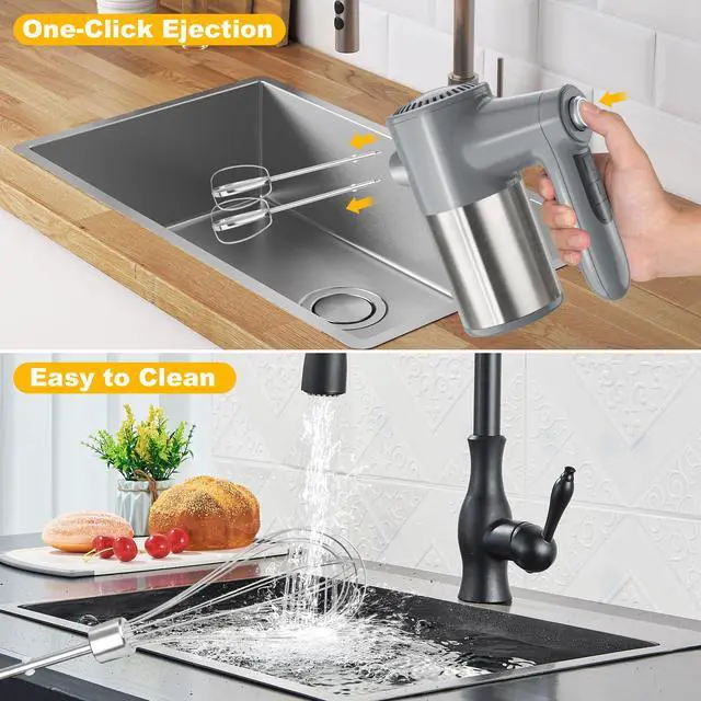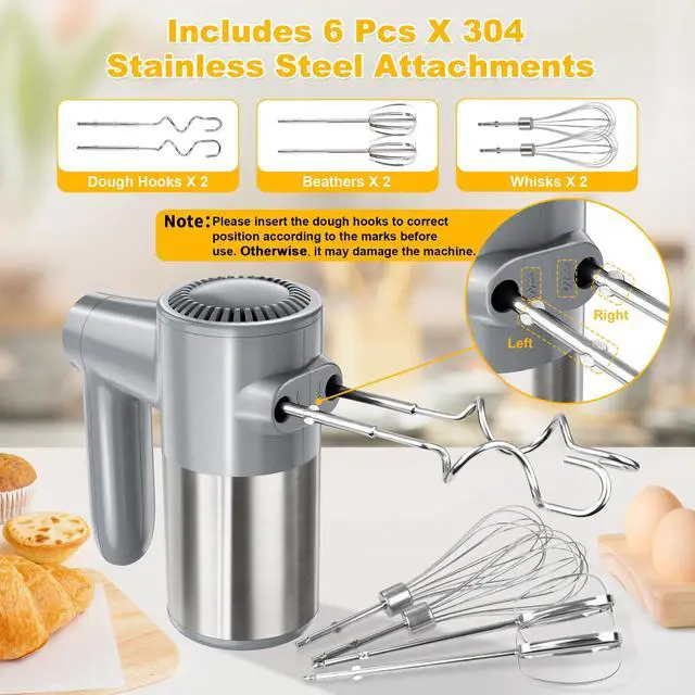 - [ONE CLICK EJECT]- The cordless hand mixer is equipped with a one - button eject feature and an ergonomic handheld handle. It's easy to operate, replace accessories, and clean. This makes cooking and baking more convenient than ever.Please pay attention to installing the dough hook according to the correct instructions in the manual, otherwise it may damage the machine.