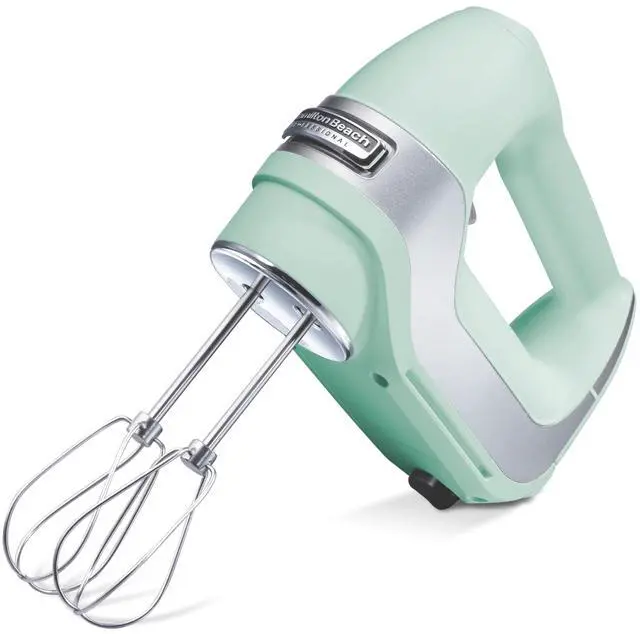 Mix any recipe effortlessly with the Hamilton Beach Professional 5-Speed Hand Mixer. This electric mixer has a slow start that prevents splatters, a QuickBurst at every level and a snap-on storage case. The attractive metallic white color with chrome bands looks great in any kitchen.