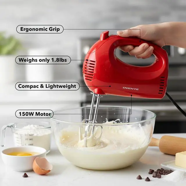 Equipped with 120V and 150-Watts of motor power, this hand mixer instantly blends ingredients together seamlessly with its high-quality whisk beaters.