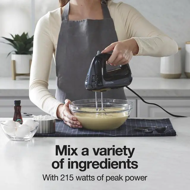 With 215 watts of peak power, the hand mixer has all the power you need to mix a variety of ingredients, whether you're preparing pancake batter, preparing mashed potatoes or whipping cream.