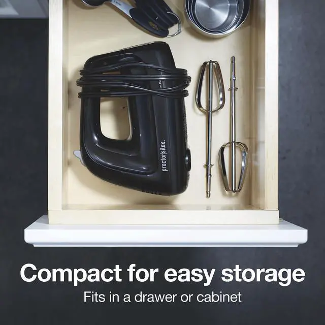 The electric hand mixer is compact to take up less space when storing. It easily fits in a kitchen drawer or cabinet.