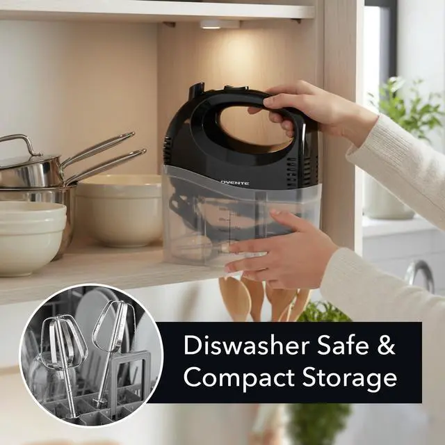 • HASSLE-FREE CLEANUP & STORAGE Easily clean the motor body by simply wiping it with a damp cloth, while the whisk beaters are dishwasher safe. The snap-on storage case conveniently holds the included attachments, helping to prevent the beaters from being lost or misplaced. Additionally, you can store the power cord in the case for added convenience.