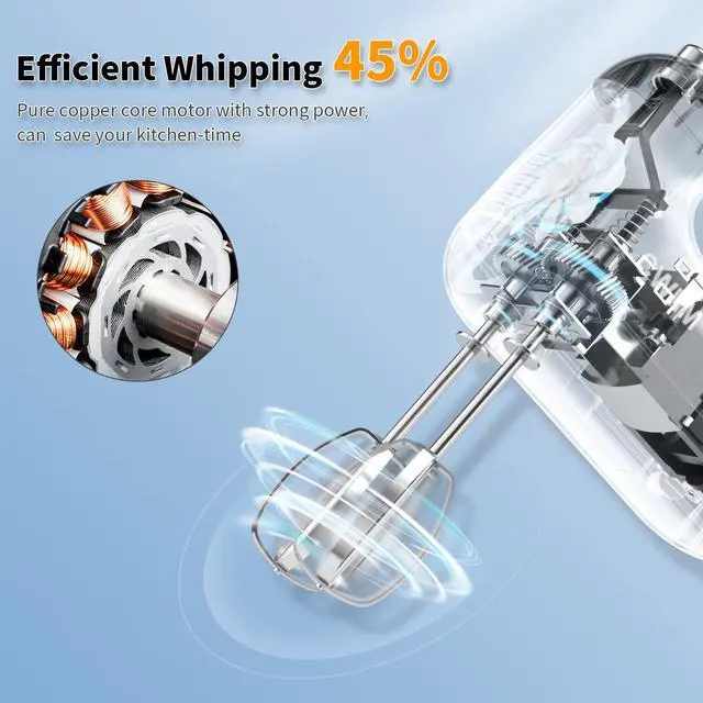 Whether it is heavy cream or dough, milk or eggs, the handheld mixer can be quickly mixed evenly by 5 speed design. It can meet you to mix a variety of mixtures.