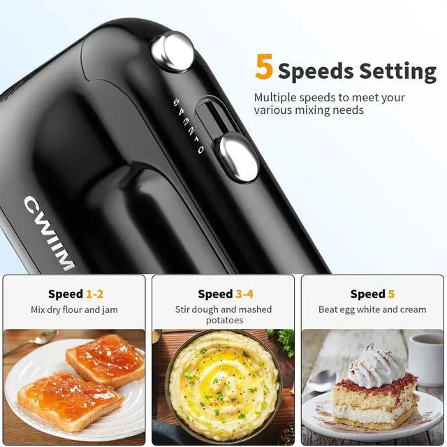 CWIIM hand mixer features high-quality 304 stainless steel attachments and 5 speed settings, which is safe and powerful, also could help you accomplish a variety of cooking tasks, such as egg white whipping, cake batter beating, oatmeal cooking mixing, bread dough kneading. CWIIM mixer will be a wonderful kitchen assistant for your exquisite life!
