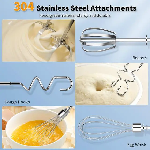 Attachments of this mixer are made of 304 stainless steel which is healthier and durable, they are food-grade materials and dishwasher safe.