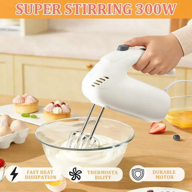 300W Hand Mixer Electric Handheld, 5 Speed Lightweight Kitchen Blender, Turbo Boost/Self-Control Speed Hand Held Beater Mixer with 4 Stainless Steel Whisks for Baking Cakes Eggs Cream, White