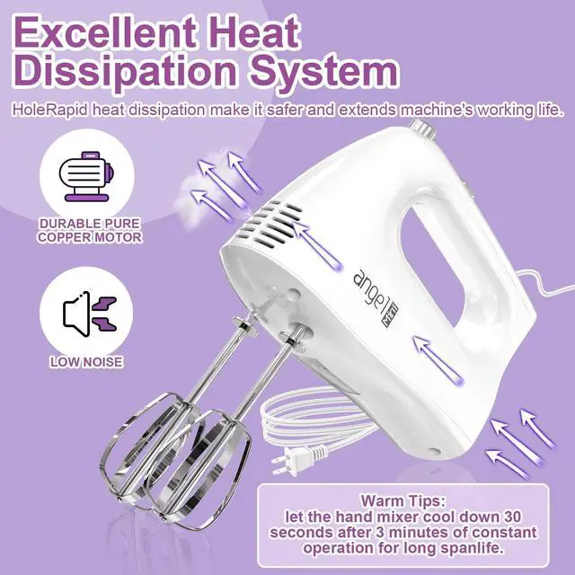 Fully considered for yourserlf, this electric hand mixer designed with vertical body, you can put it on your countertop and not worry about the dirty table. Just enjoy your happy cooking time!