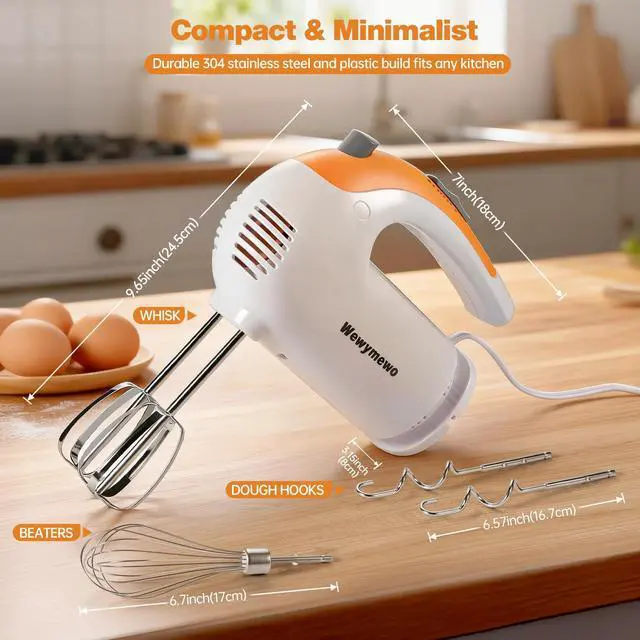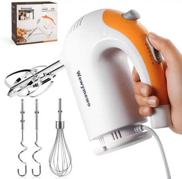 Whats IncludedThis hand mixer electric handheld features a food-grade ABS body with 5 stainless steel attachments: 2 beaters, 2 dough hooks, and 1 whisk. Safely and effortlessly mix cakes, cookies, pizza dough, brownies, mashed potatoes, and other dishes.