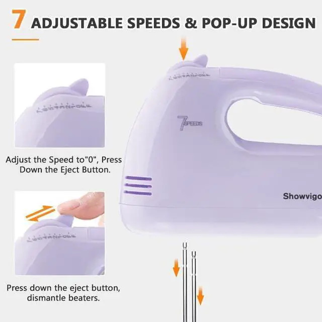 7 Adjustable SpeedsEach user can adjust the speed by pushing the button up and down, the hand mixer has 5 mixing speeds from 1 (lowest) to 7 (highest), you can choose the most suitable speed stops according to your needs for the best mixing results.