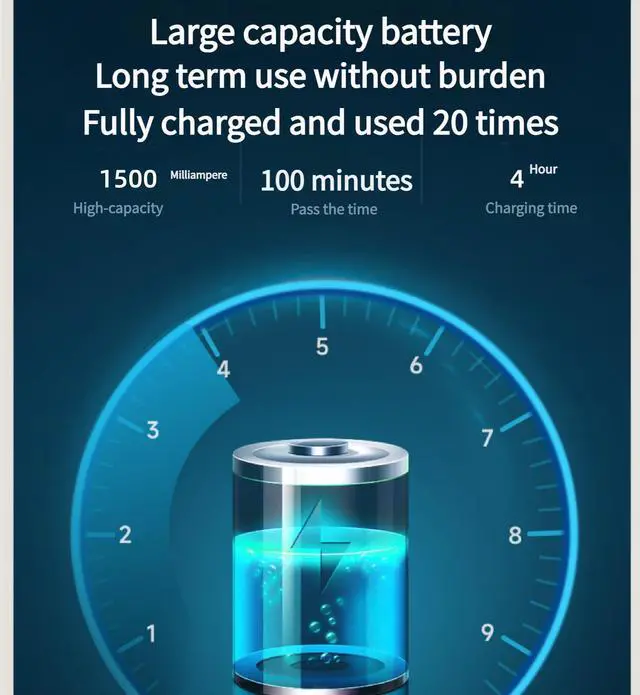 One full charge gives you about 20 mixing sessions (think 2-3 minutes each). It charges fully in 3-4 hours via any USB-C port laptop, power bank, car charger.