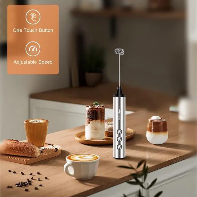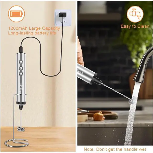 Featured a flat bottom, sleek and compact design, our hand held frother can stand independently even without a stand, freeing up your hands for other tasks. Perfect for on-the-go use and gifting, it's a convenient companion for coffee lovers everywhere.