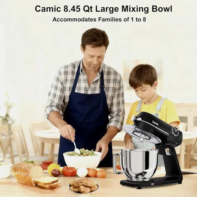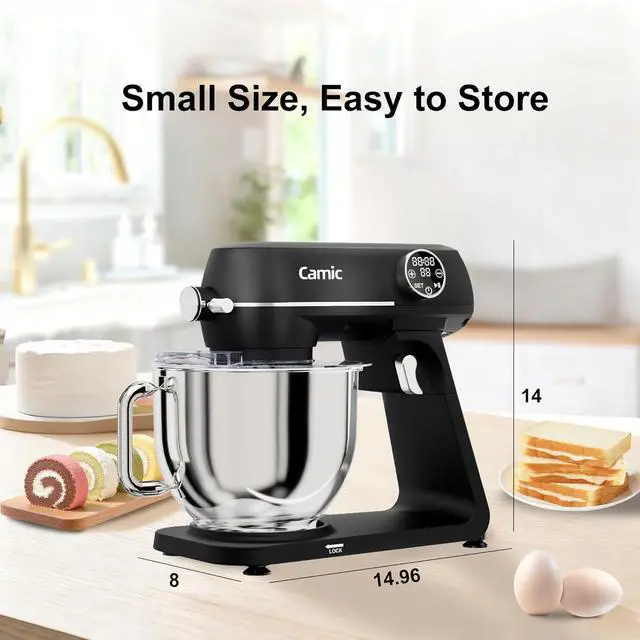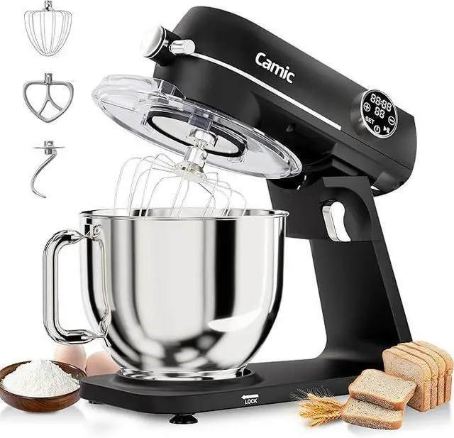 Multi-Functional Mixing Attachment SetIncluding dough hook, whisk and beater. Camic stand mixer three multifunctional attachments allow you to knead pizza dough, mix cookie dough and whip cream - anything goes. The splash guard with access hatch helps add ingredients without making a mess.Coming with versatile attachments like an egg beater, dough maker, and cake mixer for baking, offering all-in-one convenience for cakes, pizza, and bread maker needs.