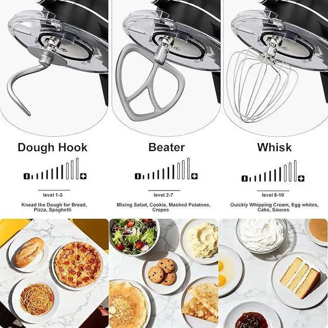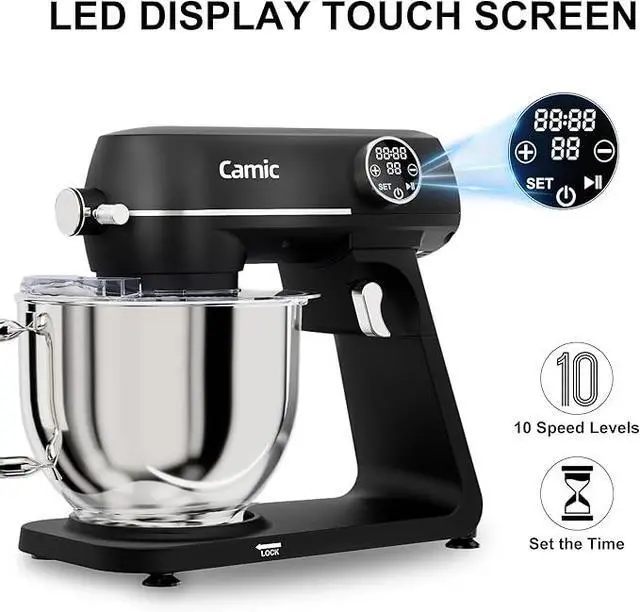 Powerful Motor and 10 Speeds ControlHigh performance pure copper motor and sturdy metal housing; 10 optimized speeds with digital LED timer helps you perfect every recipe. Powerful dough mixer suitable for mixing bread dough, thick batters, meringues, and whipping cake cream, plus lower speeds for stirring and finessing your most delicate concoctions,could suit perfectly to different ingredients.