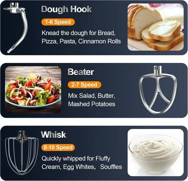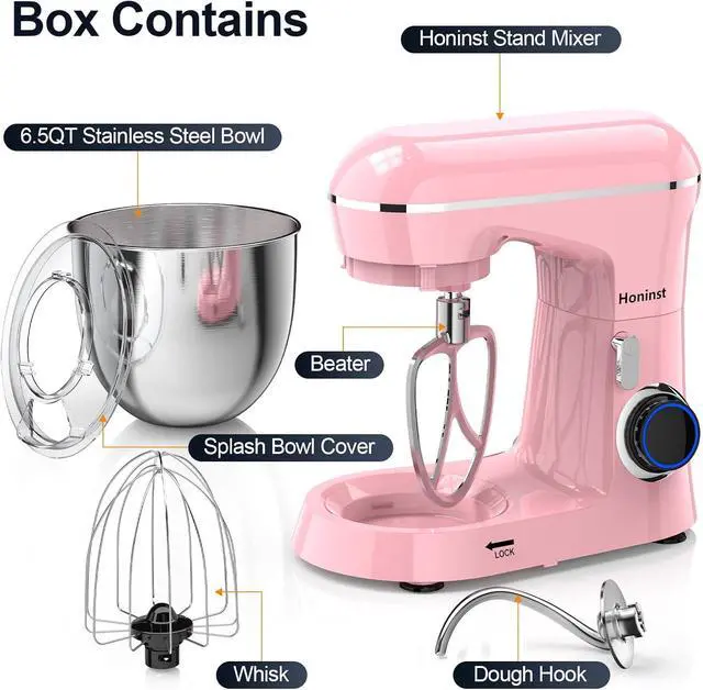 Multiple AccessoriesHoninst Household Stand Mixer comes with 3 accessories: dough hook, whisk and beater, all obtained Food Safety ETL Certification. From whipping cream to kneading dough, from bread, cakes, pizzas to pastry, muffins and waffle, meet all your cooking needs and free your hands for easy cooking