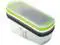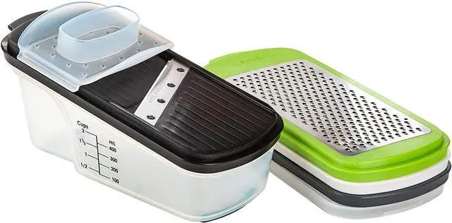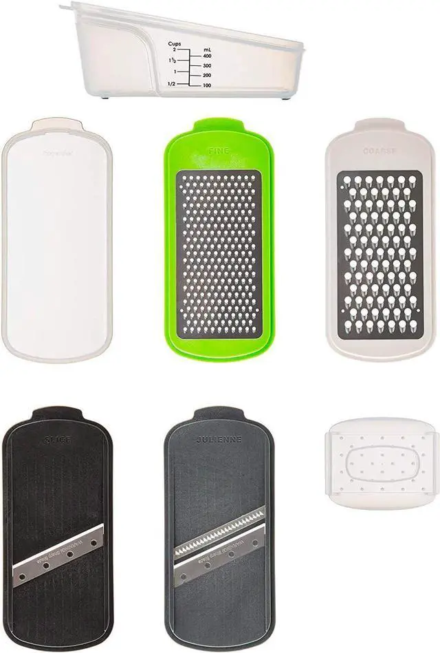Includes: coarse grater, fine grater, straight slicer and julienne slicer. Hand guard for safe slicing and grating. Measures up to 2 cups or 400 ml. Panels nest together with cover for safe storage. BPA-free