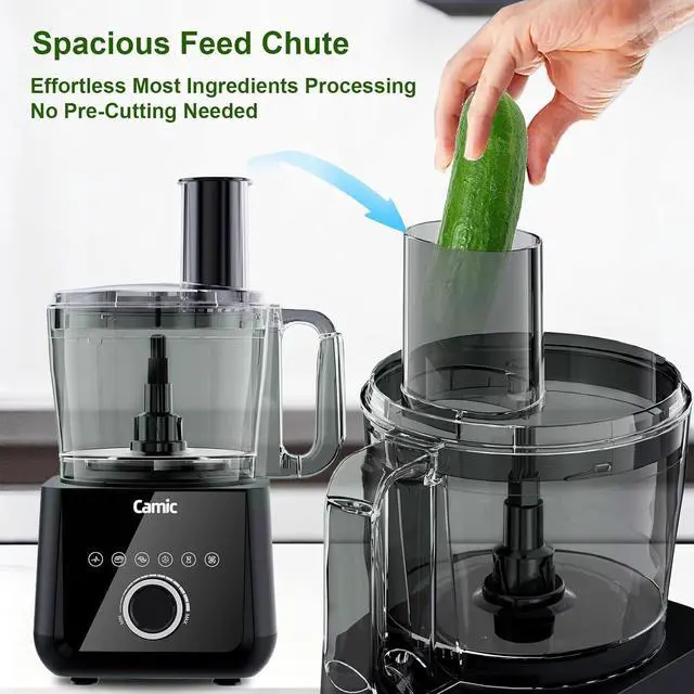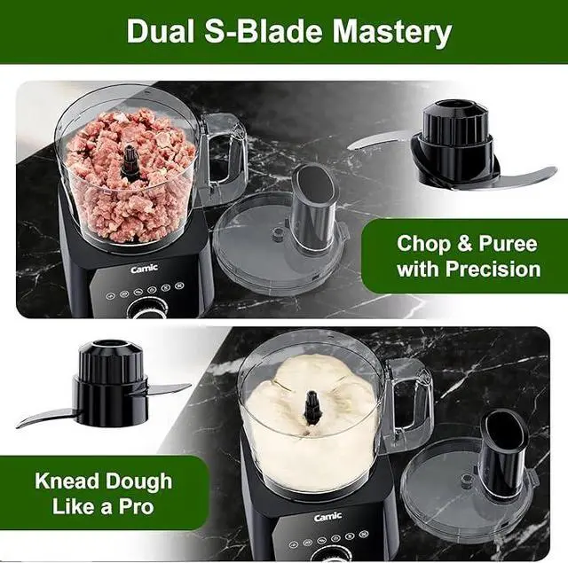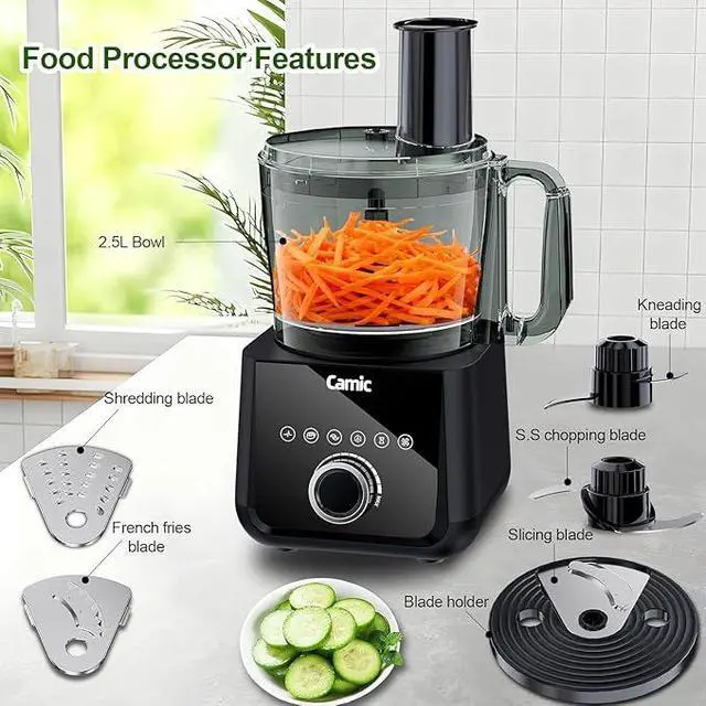 Standard Version FeaturesKitchen tasks such as chopping, mincing, blending, slicing, shredding, kneading and battering are made easier with the Camic food processor. Basic meal prep processing is covered. Whether you are a novice cook or a busy housewife, it meets all your food processing needs.Equipped with a S.S chopping blade, Kneading blade for dough, French fries blade and slicing/shredding disk, this multitasking food chopper is your new go-to for prepping baby food, vegetables, meats, and more.
