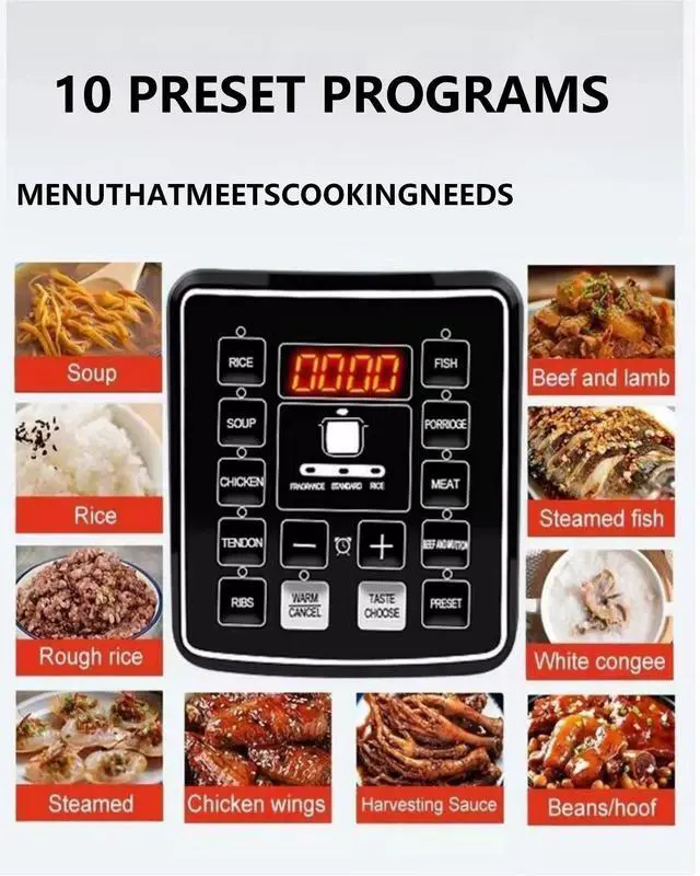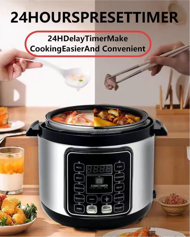 Equipped with intelligent one-touch programs, 24-hour delay start, and automatic keep-warm. Built-in safety features include pressure limiting valve, anti-dry protection, and automatic pressure release—making it safe for beginners and the elderly.