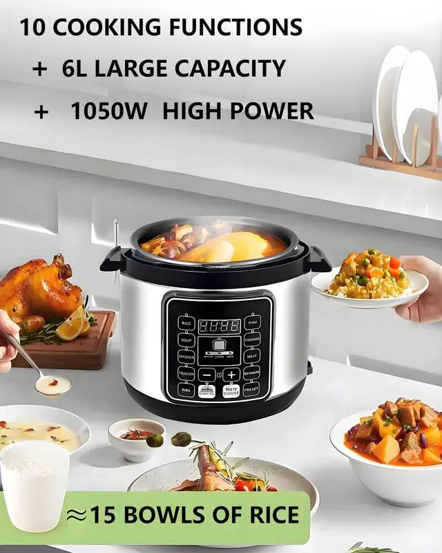 With a generous 6-liter capacity, this pressure cooker easily handles family dinners, weekend gatherings, and multi-child households. Cook up to 8–10 cups of rice at once and prepare soups, stews, and roasts in one go—no more batch cooking!