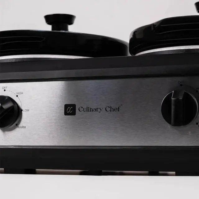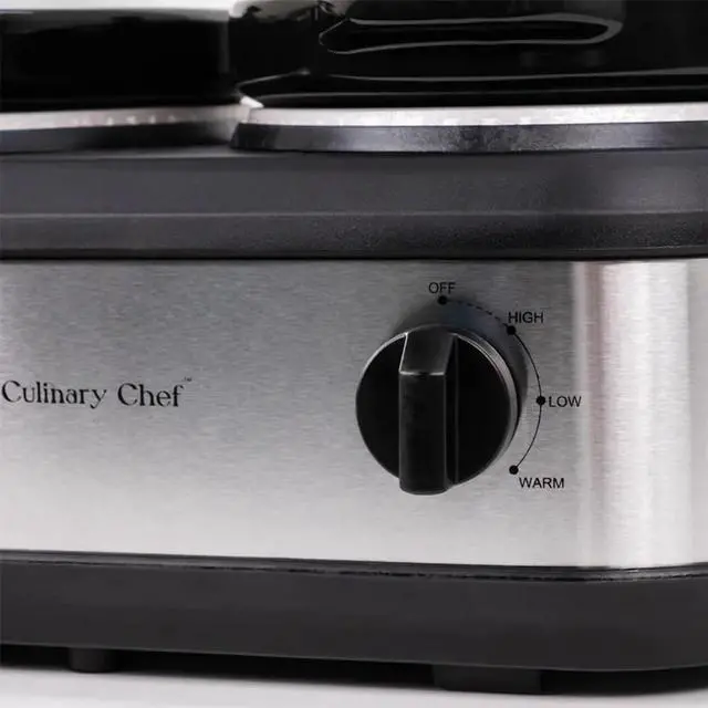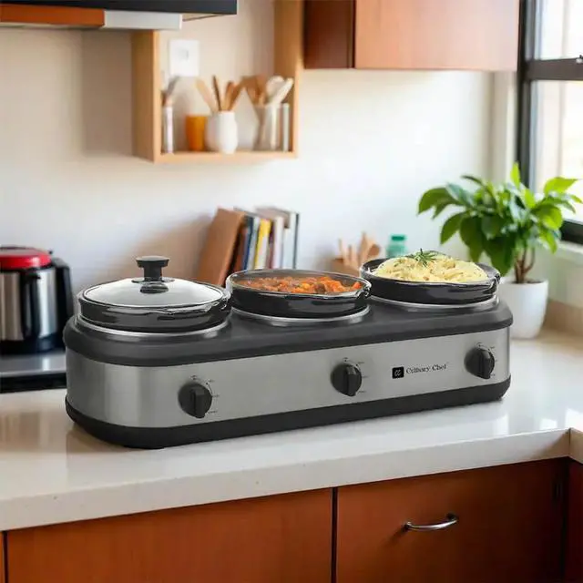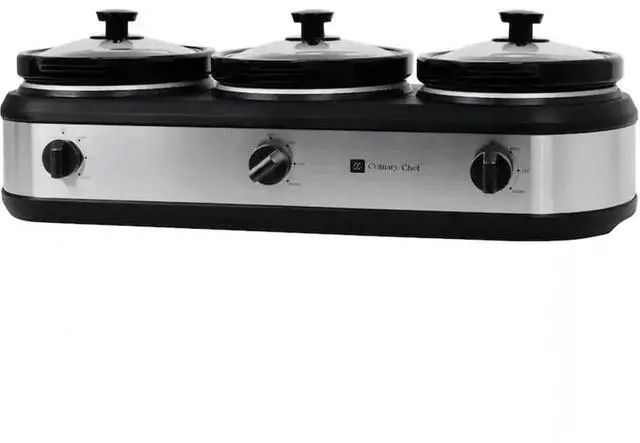 Hosting parties will be easier than ever with the help of this Culinary Chef Triple Slow Cooker and Buffet Server. It features three 2.5 qt. oval-shaped stoneware pots with individual temperature controls. The three individual stoneware pots are removable for easy serving and cleaning. Each pot has its own tempered glass lid which locks in heat and moisture. Nonskid feet add stability during use.