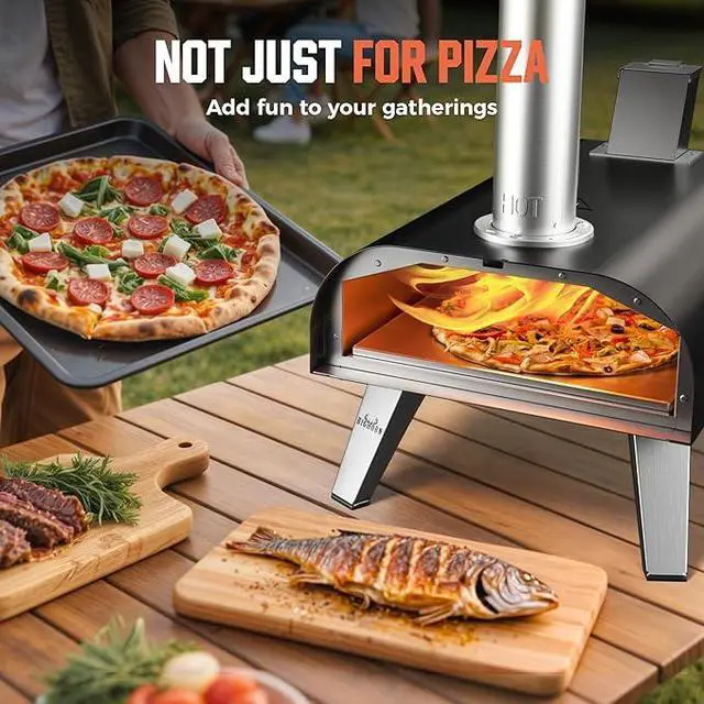 3-in-1 Multi-Fuel Pizza OvenPellet Pizza Oven for authentic wood-fired flavor, or switch seamlessly to BIG HORN Gas/Electric Burner attachments (sold separately). Ready in 1820 min, reaches 887°F for perfect pizzas in 6090 sec, plus steaks, fish, lamb, burgers, vegetables. Portable and suitable for indoor or outdoor use, rain or shine, all year round