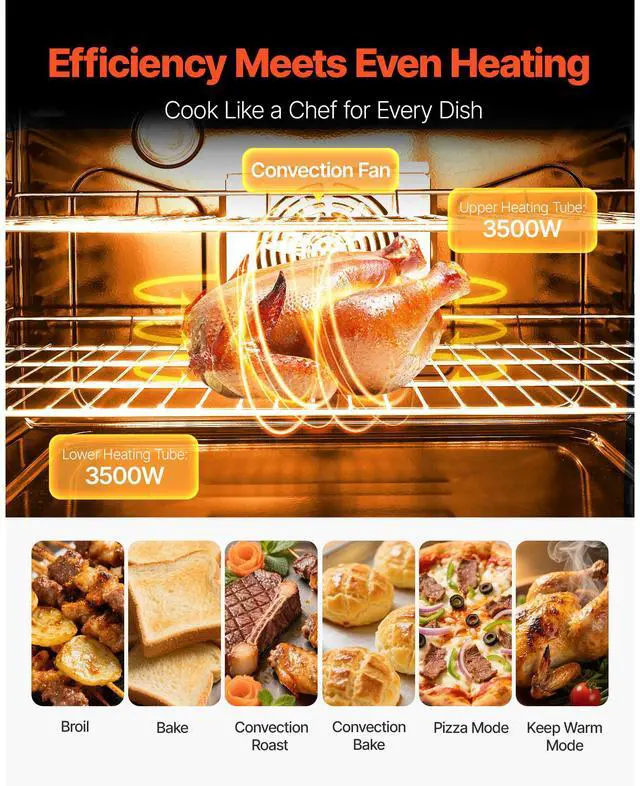 Functions: Bake, Broil, Convection Bake, Convection Roast, Pizza Mode, Keep Warm Mode