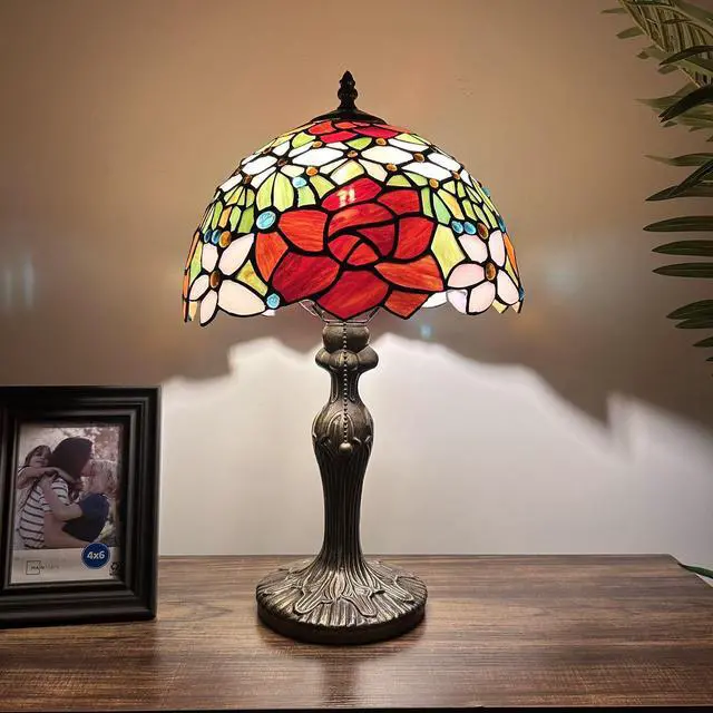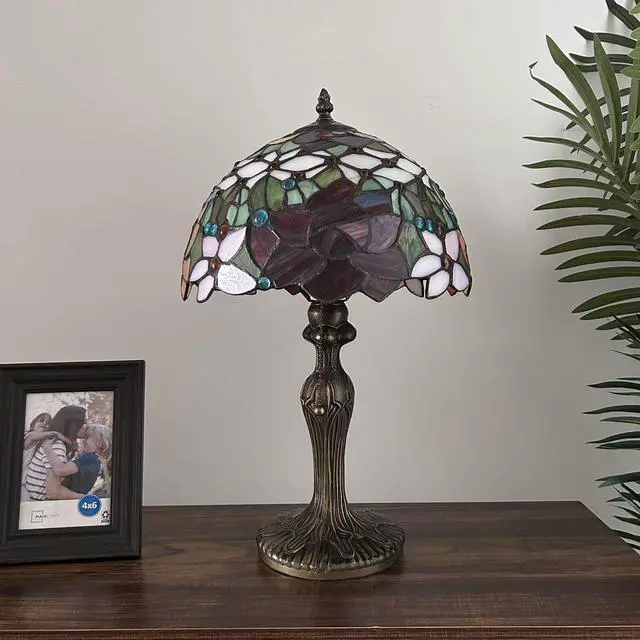 12"W*12"D*19"H, Zinc Alloy base with bronze finish. Pull Chain switch, LED Bulb Included, UL Listed, Each piece of stained glass is hand-soldered into place using the traditional copper foil technique.