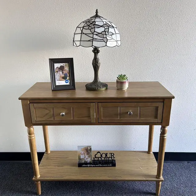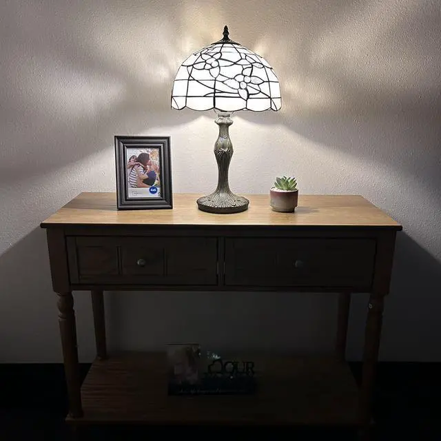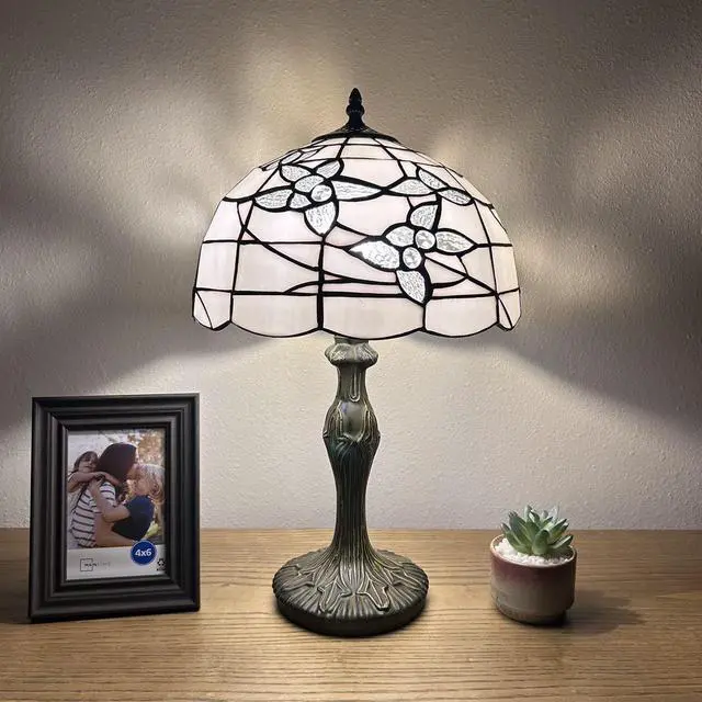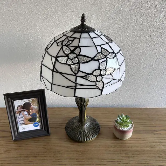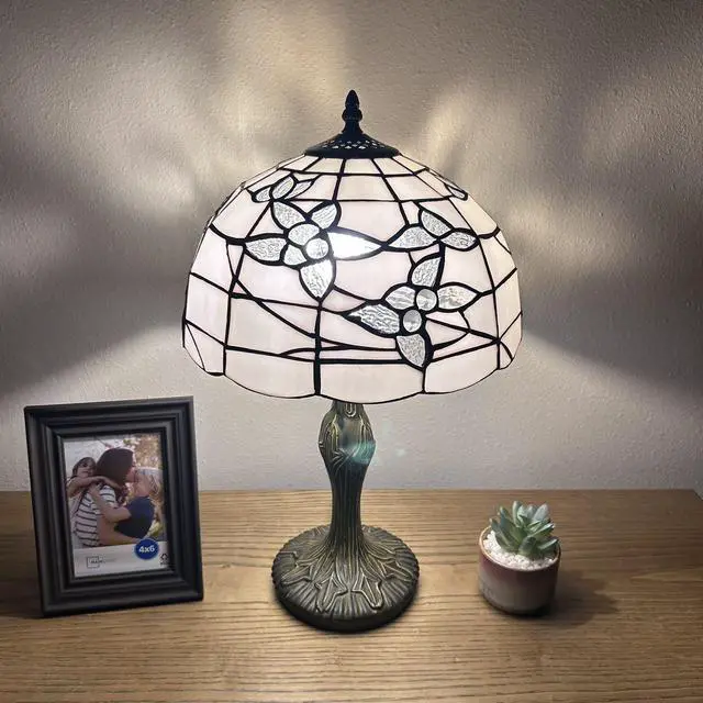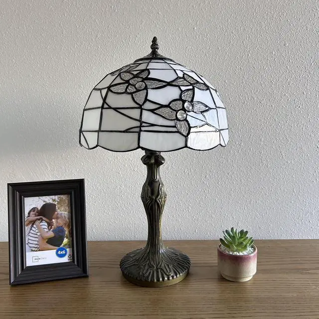 12"W*12"D*19"H, Zinc Alloy base with bronze finish. On/Off switch, UL Listed, Each piece of stained glass is hand-soldered into place using the traditional copper foil technique.