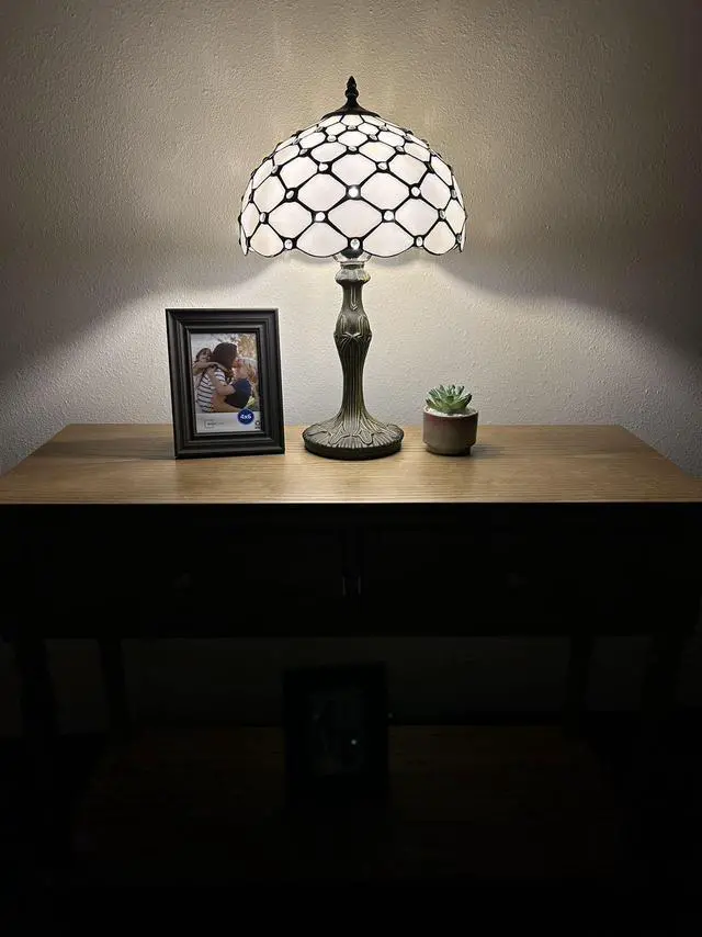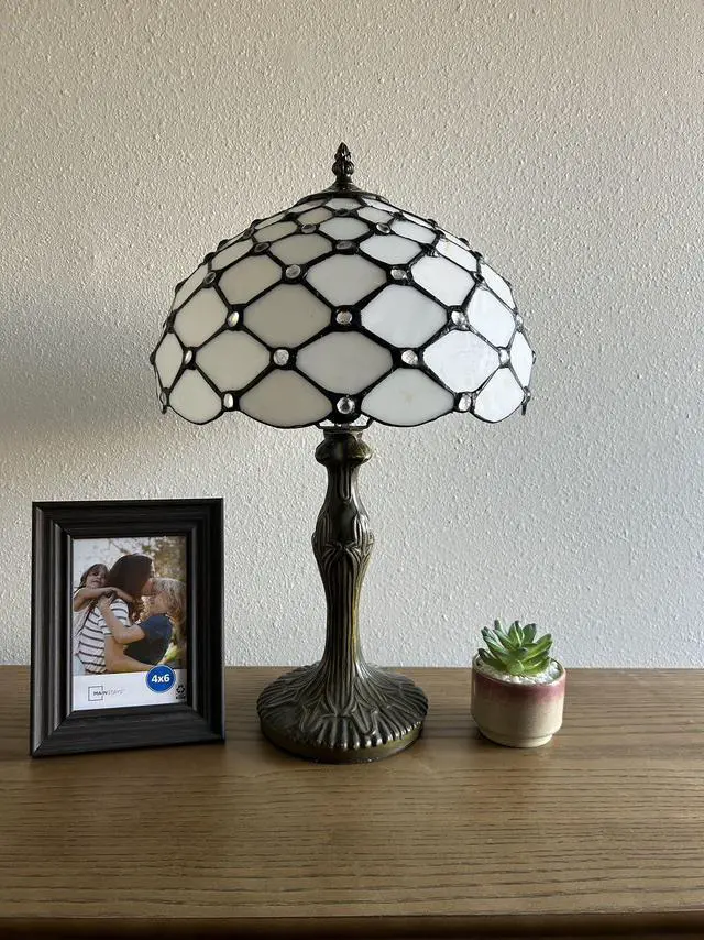 12"W*12"D*19"H, Zinc Alloy base with bronze finish. On/Off switch, UL Listed, Each piece of stained glass is hand-soldered into place using the traditional copper foil technique.