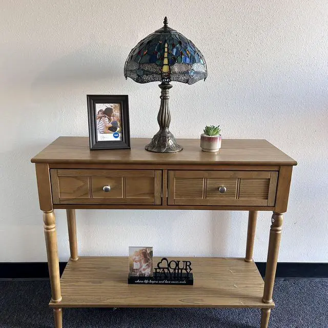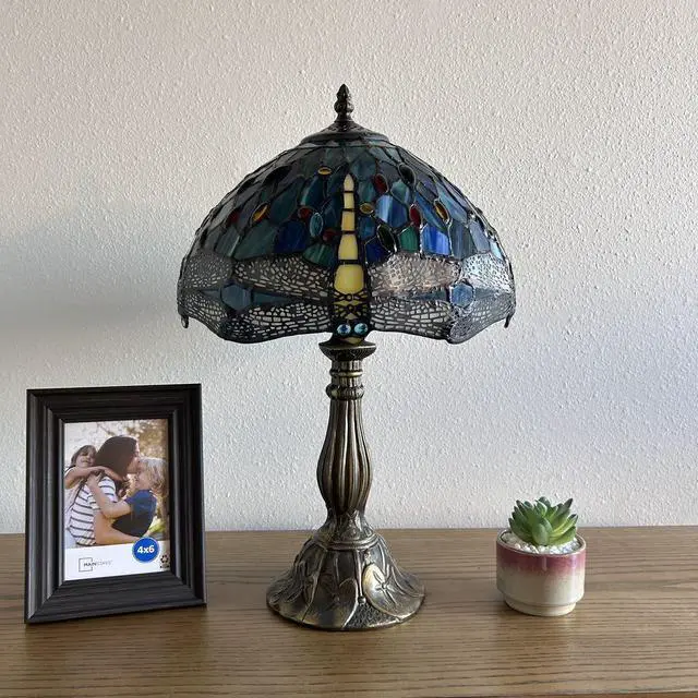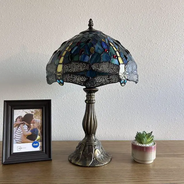 12"W*12"D*19"H, Zinc Alloy base with bronze finish. On/Off switch, UL Listed, Each piece of stained glass is hand-soldered into place using the traditional copper foil technique.