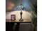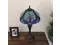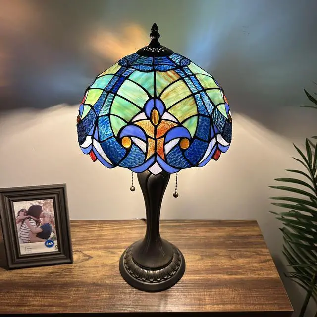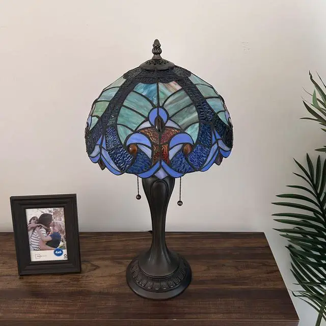 12"W*12"D*22"H. Stained glass shade. Resin base with bronze finish. Pull Chain switches, LED Bulbs Included, UL listed. Each piece of stained glass is hand-soldered into place using the traditional copper foil technique.