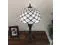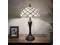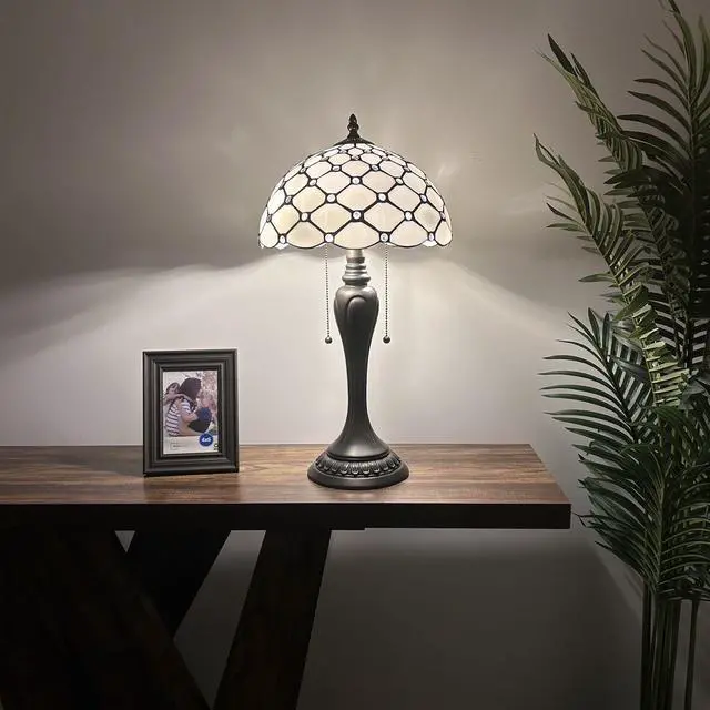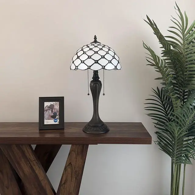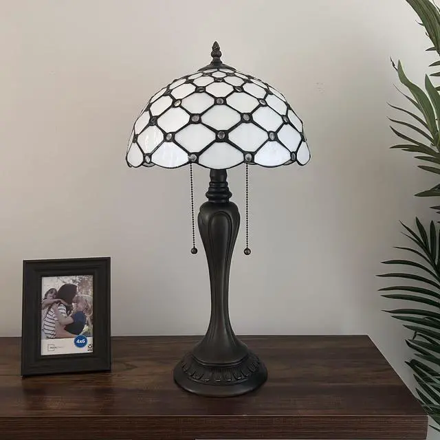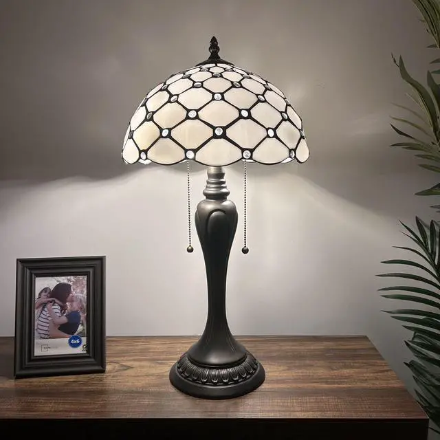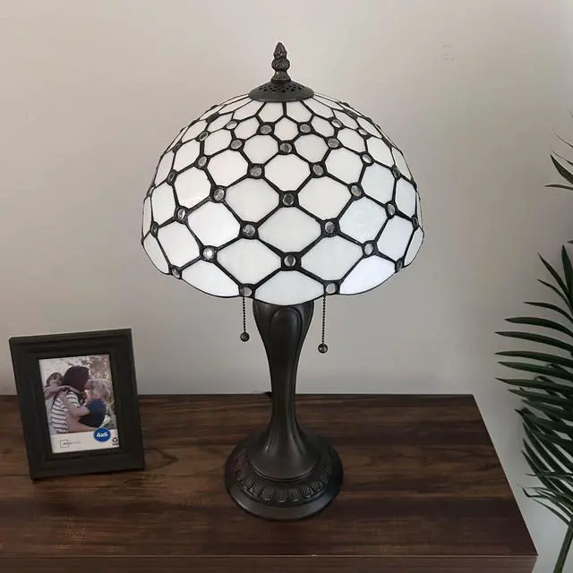 12"W*12"D*22"H. Stained glass shade. Resin base with bronze finish. Pull Chain switches, LED Bulbs Included, UL listed. Each piece of stained glass is hand-soldered into place using the traditional copper foil technique.