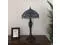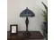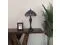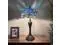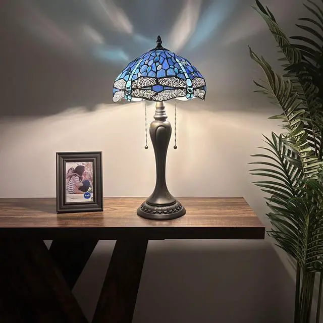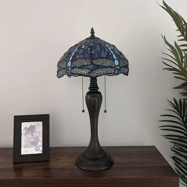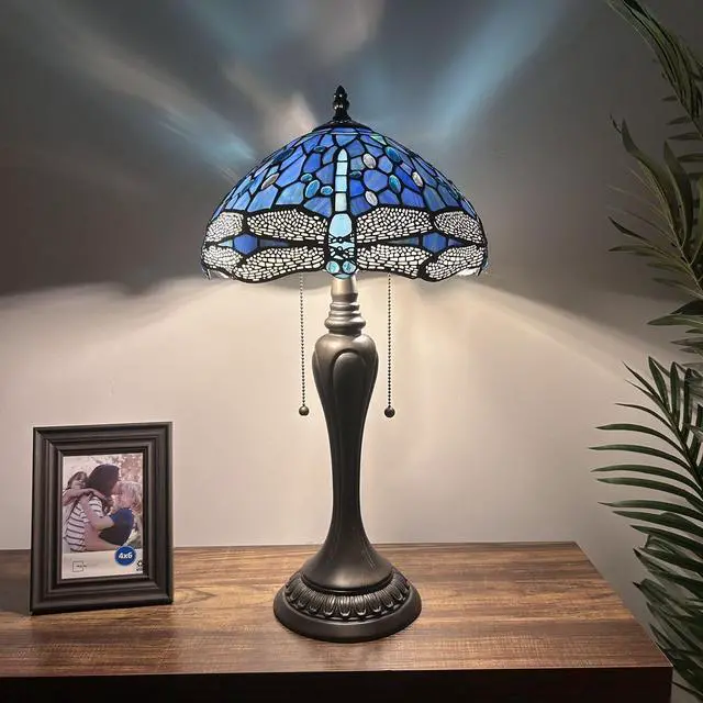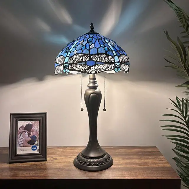 12"W*12"D*22"H. Stained glass shade. Resin base with bronze finish. Pull Chain switches, LED Bulbs Included, UL listed. Each piece of stained glass is hand-soldered into place using the traditional copper foil technique.