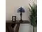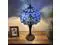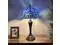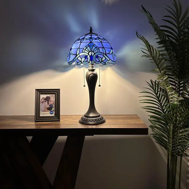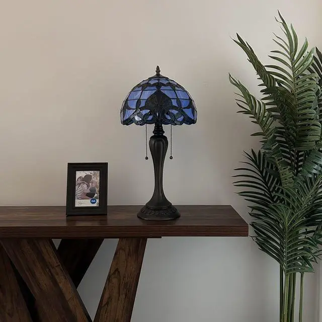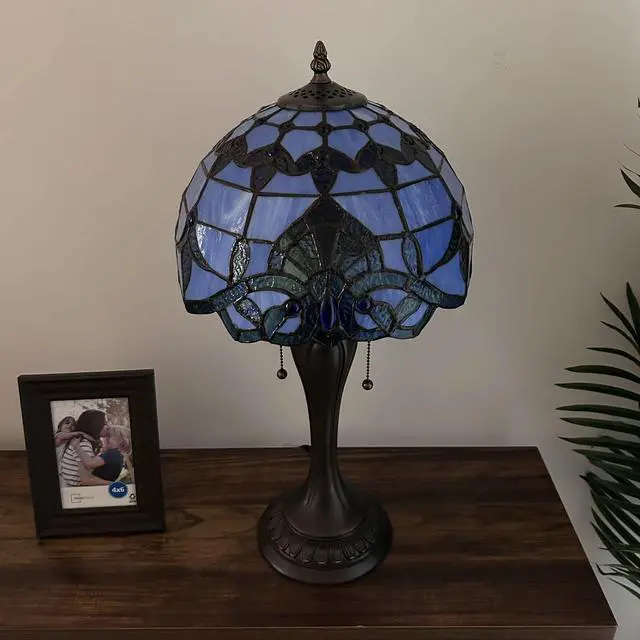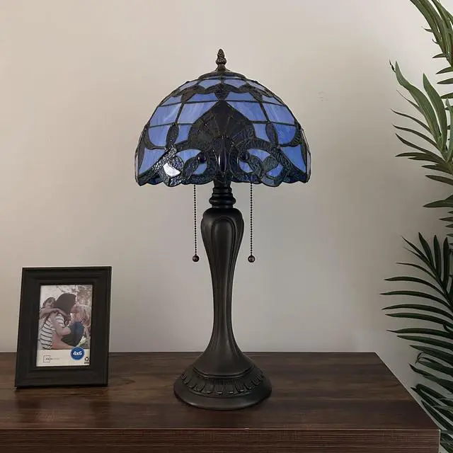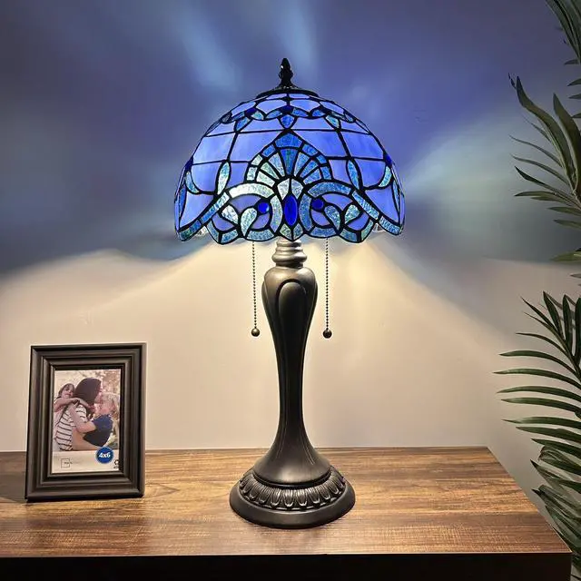 12"W*12"D*22"H. Stained glass shade. Resin base with bronze finish. Pull Chain switches, LED Bulbs Included, UL listed. Each piece of stained glass is hand-soldered into place using the traditional copper foil technique.