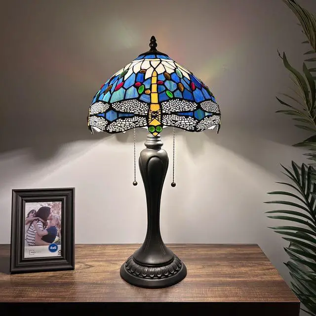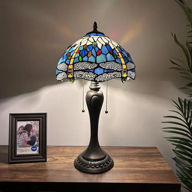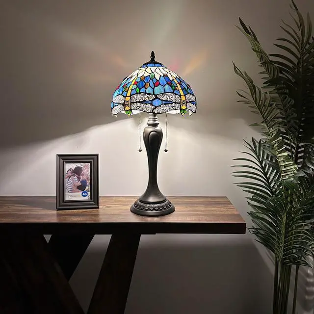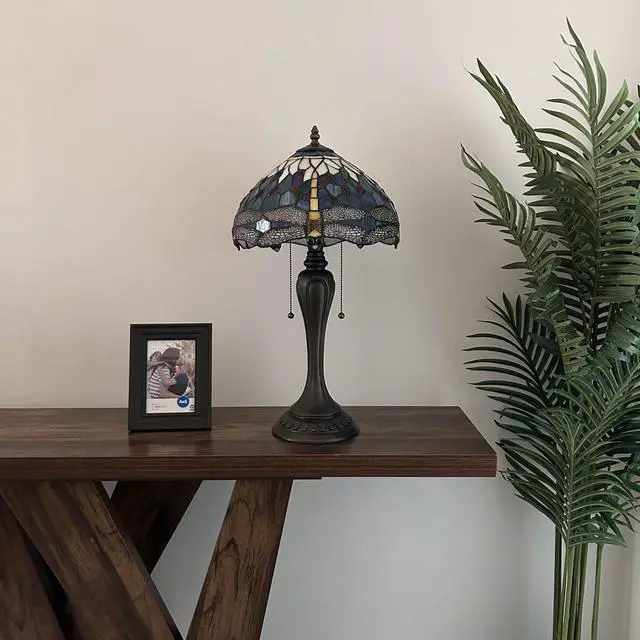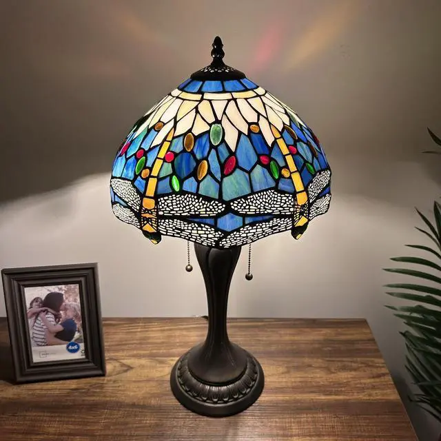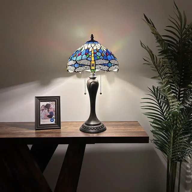 ENJOY DECOR LAMPS Tiffany Style Table Lamp Dragonfly Blue Stained Glass Included LED Bulbs for Living Room Bedroom Bedside 12"W*12"D*22"H
