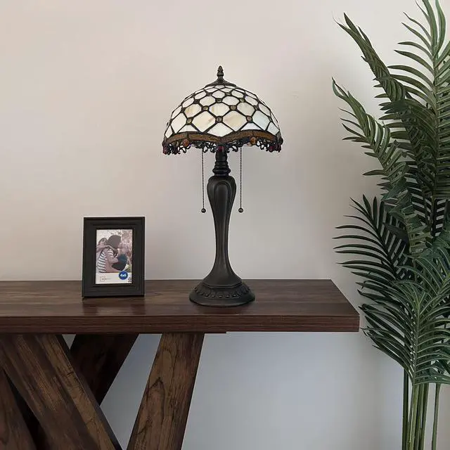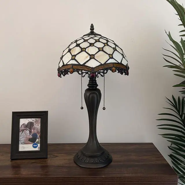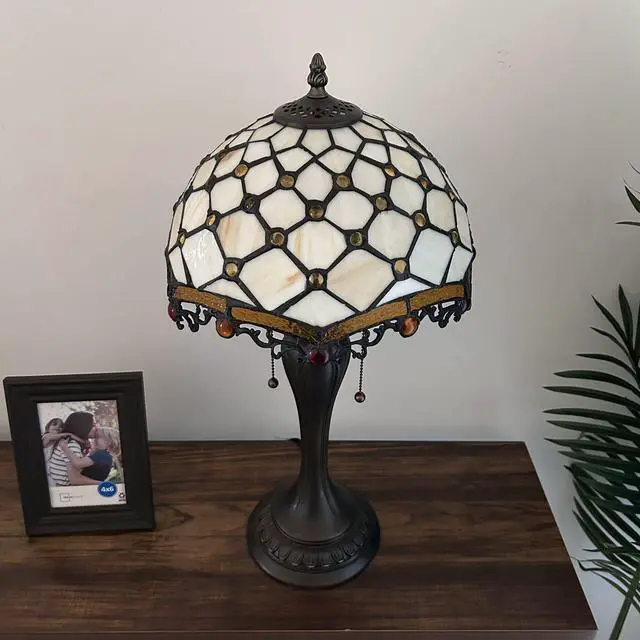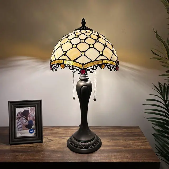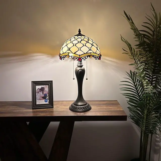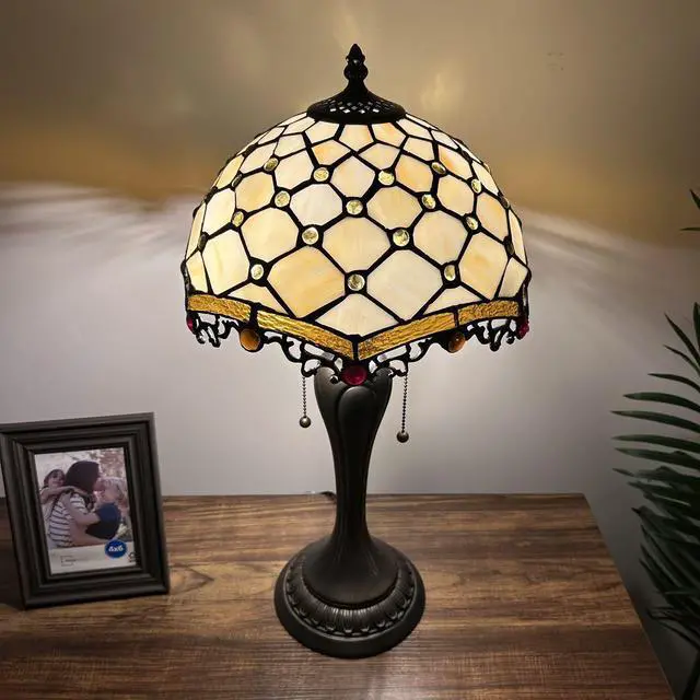 ENJOY DECOR LAMPS Tiffany Style Table Lamp Beige Stained Glass Crystal Beans for Living Room Bedroom Bedside 12"W*12"D*22"H